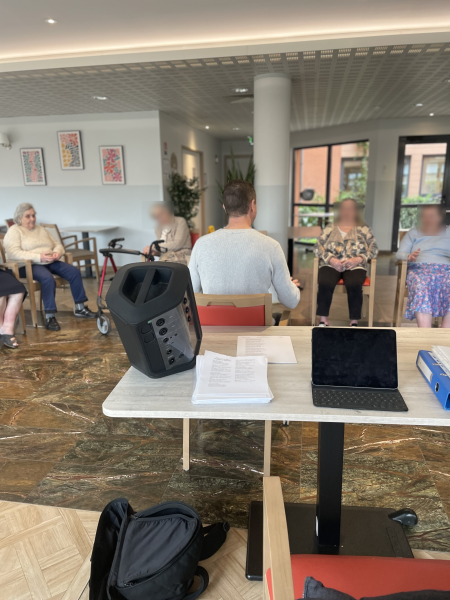 Une fois ces préparations terminées, les résidents commencent à chanter. Les chansons proposées sont des titres qu’ils connaissent déjà, ce qui facilite leur participation et leur permet de chanter plus facilement. Pour travailler la mémoire et la confiance en soi, les chansons sont reprises en trois étapes :